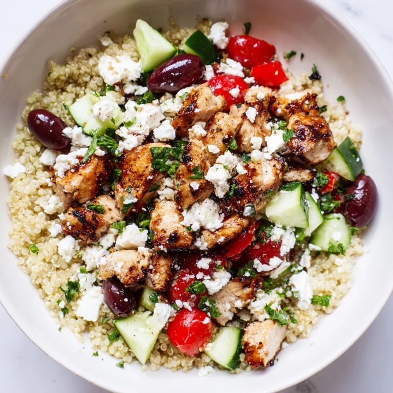 I've swapped the chicken for grilled shrimp, seared salmon, or even crispy roasted chickpeas when I wanted it vegetarian. My sister adds roasted red peppers and artichoke hearts, and my dad insists on a handful of arugula for extra greens. The quinoa can be replaced with couscous, farro, or even cauliflower rice if you're cutting carbs. This recipe is more of a template than a rulebook, and it gets better the more you play with it.